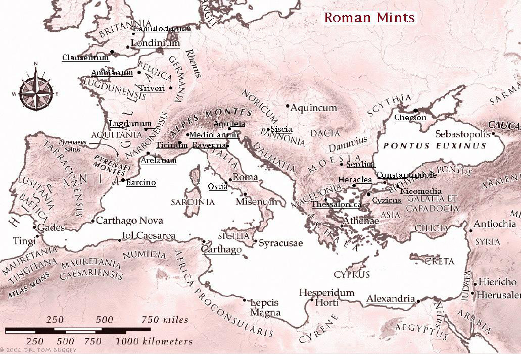 V níže uvedené mapě antických (římských) mincoven je ukryta fatální chyba, objevíte ji?